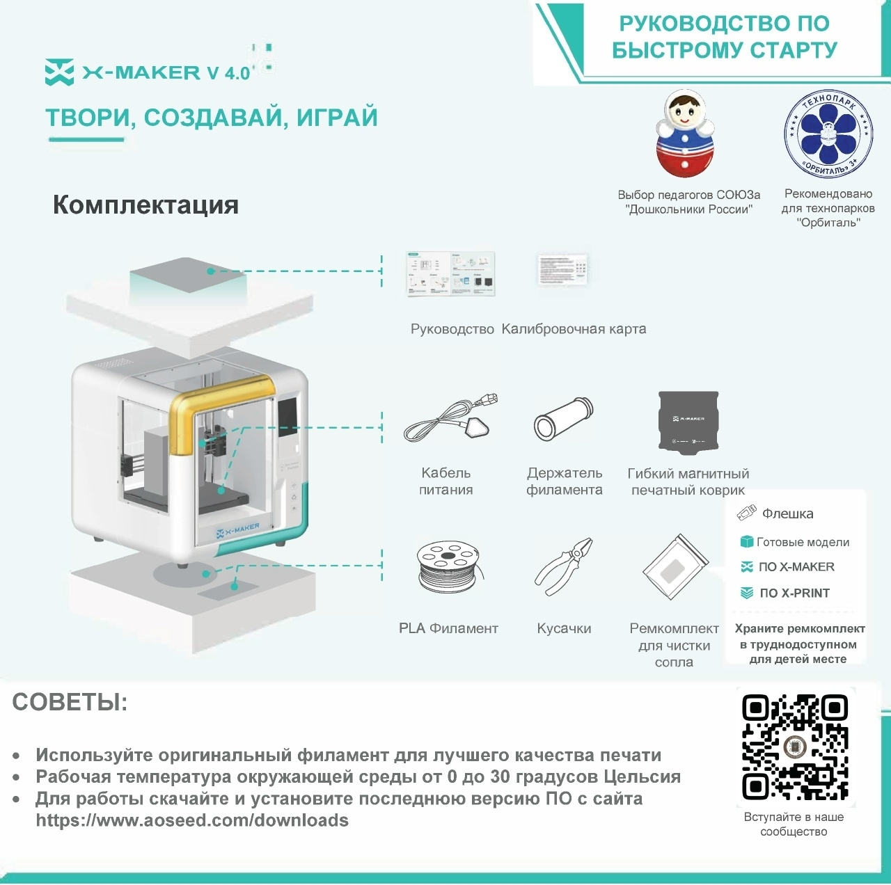Состав комплекта: 1.Образовательный 3Д принтер Х-МАСТЕР старт 1 шт. 2. Катушка филамента случайного цвета 1 шт. 3. Кусачки для работы с филаментом 1 шт. 4. Калибровочная карта 1 шт. 5. Инструмент для чистки сопла 1 шт. 6. Гибкий магнитный печатный коврик 1 шт. 7. Листы с наклейками для собственного дизайна принтера 2 шт. 8. Держатель катушки филамента 1 шт. 9. Инструкция на русском языке 1 шт.