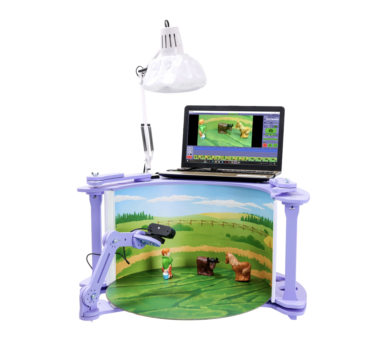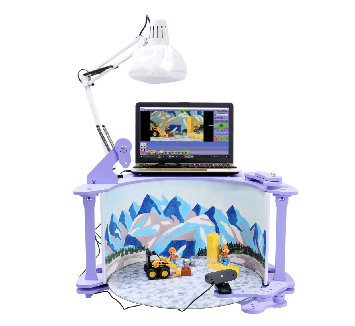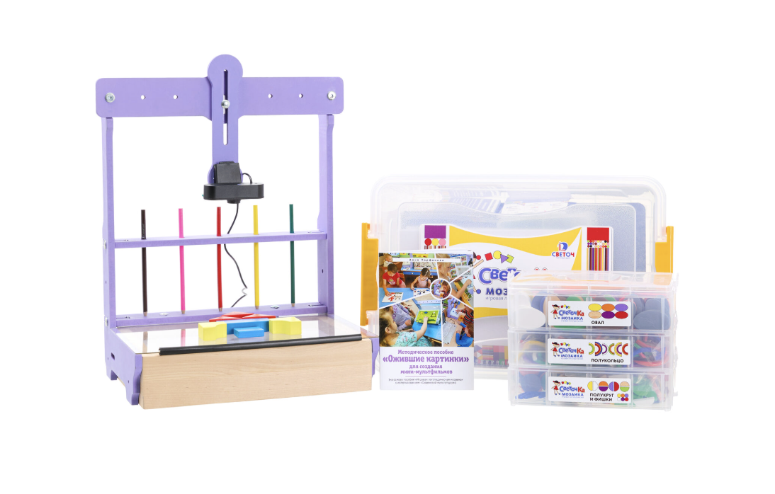СОСТАВ: — Мультстанок для кукольной анимации малый — 1шт.; — Лампа на струбцине c рассеиваетелем света — 1 шт. ; — Веб-камера автофокус — 1шт.; — Комплект тематических фонов (3шт., пластик); — Дополнительная сцена — 1шт.; — Подложка на сцену (2шт., пластик); — Фон белый — 1шт.; — Набор героев сказок — 3шт.; — Комплект фонов (от 3 до 8шт. к каждой сказке, пластик) — 16шт.; — Сценарий — 3шт.; — Набор для творчества Стандарт; — Методическое пособие по анимации; — Методическое пособие/конструктор программ (ОВЗ); — ПО АртИгрушка с ключом (предоставляется по ссылке); — Видео курс по анимации (предоставляется по ссылке).